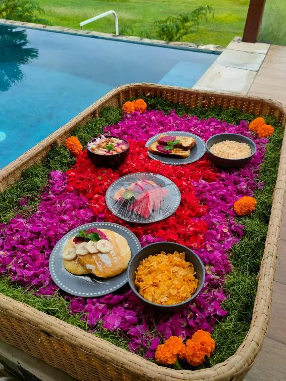 ☺ Breakfast has various selections. The pool is located upstairs overlooking rice paddies and occasionally you can see the volcano