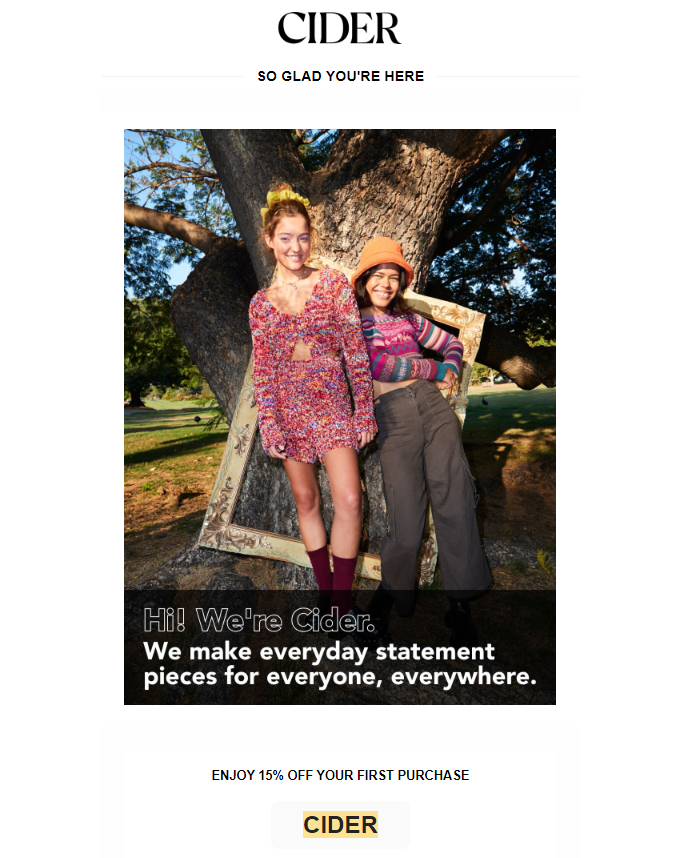 For example, look at the welcome email of Cider, they welcome the customer and offer a 15% discount on the first purchase.