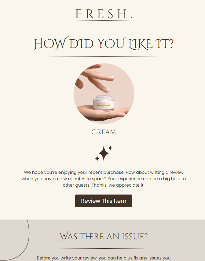 Designed with simplicity and efficiency in mind, this follow-up email template features a clean and streamlined design that is perfect for requesting post-purchase feedback from your valued customers.