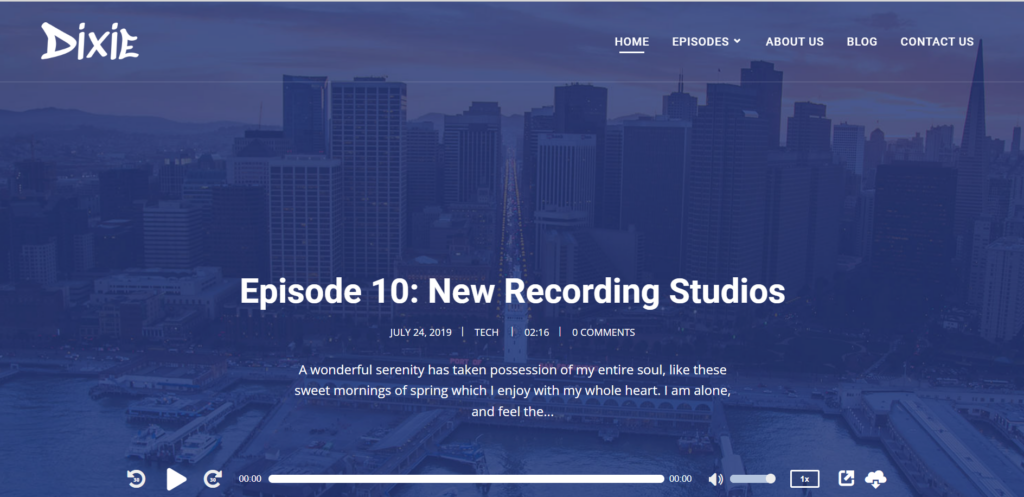Dixie is a WordPress theme made just for podcasters, with an attractive homepage with a fullscreen background and episode player.
