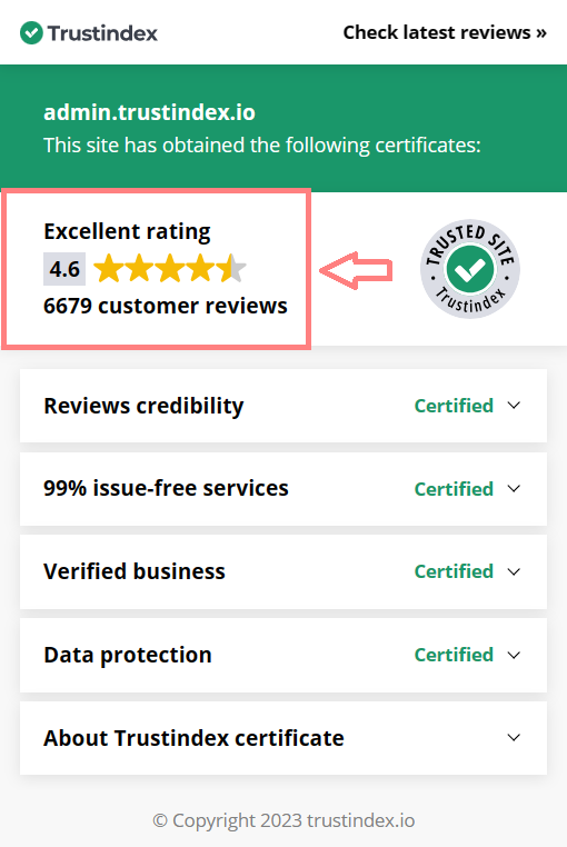 Trustindex verifies your business details & reviews and gives you a stylish, non-distractive Review Certificate widget for it, which you can upload to your website. This way your website visitors feel more safe browsing and shopping on your site.