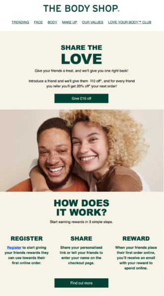 Take a look at an email example from The Body Shop, which effectively employs direct response marketing to prompt customers to join their referral.