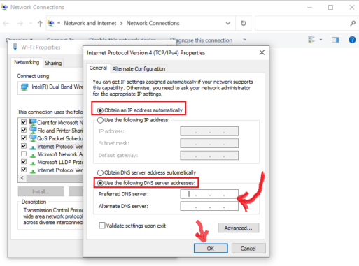 By following these steps, you can alternate server addresses by choosing to obtain an IP address automatically or by manually entering the addresses you obtained from a public server.