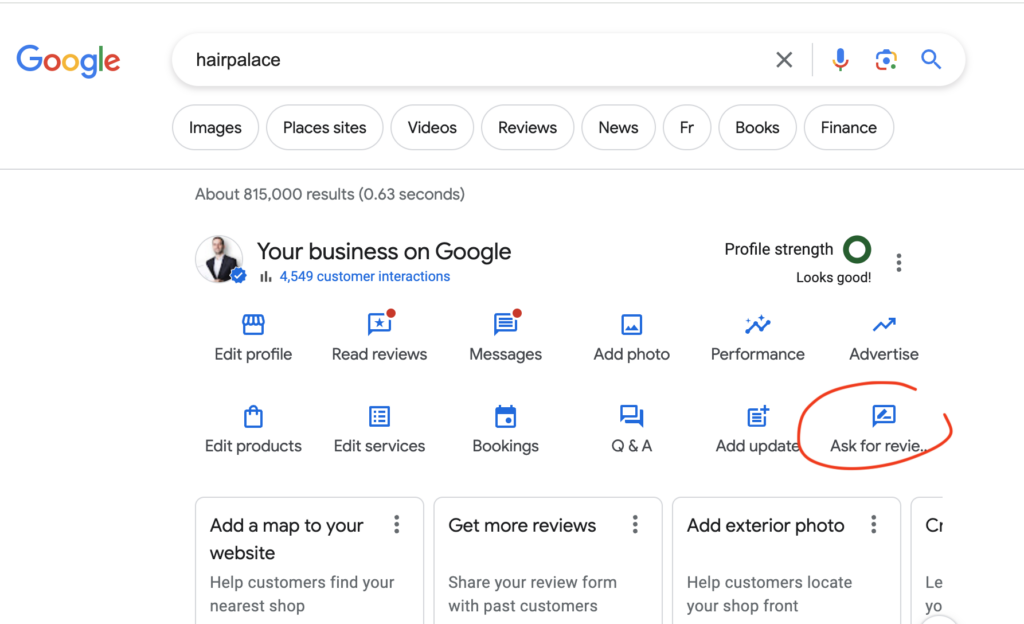 Step 2: Scroll down to see new options from your Google Business Profile. Click on ’Ask for reviews’.