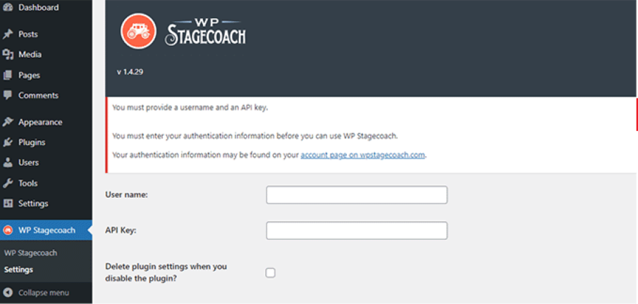 3.) Retrieve your WP Stagecoach username and API key from your account on the plugin website.