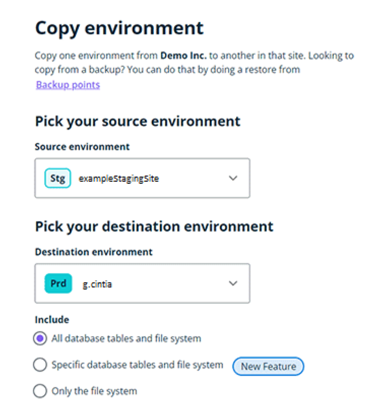 - ‘Copy an existing environment to this site’: Copy an existing environment, such as your live or development site, to the staging environment.