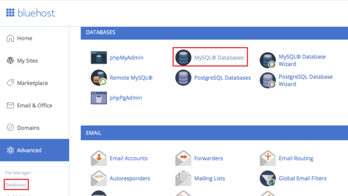 1.) Access the control panel of your WordPress hosting account and locate the ‘MySQL Databases’ icon within the ‘Databases’ section.