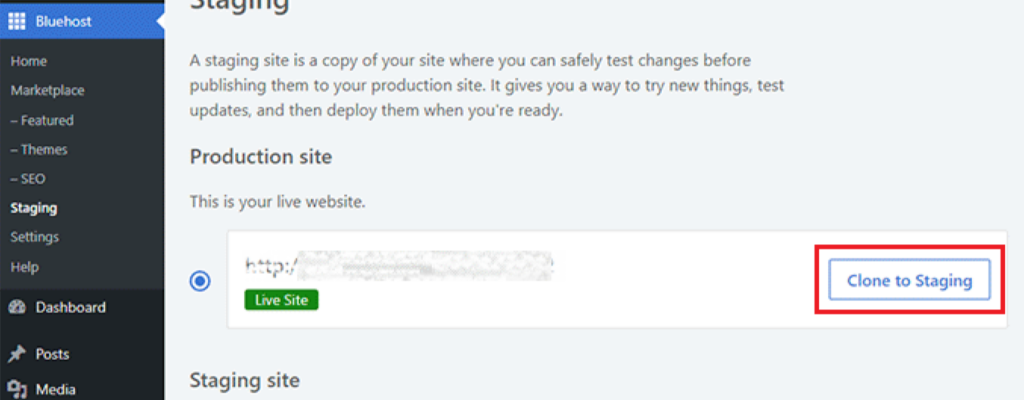 1.) To do this, navigate to the Bluehost » Staging site and locate the ‘Clone to staging’ button.