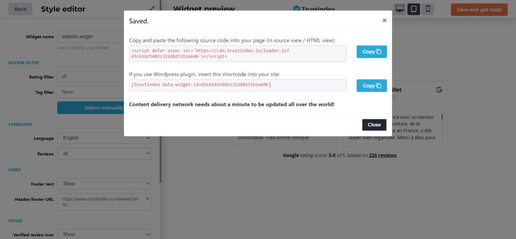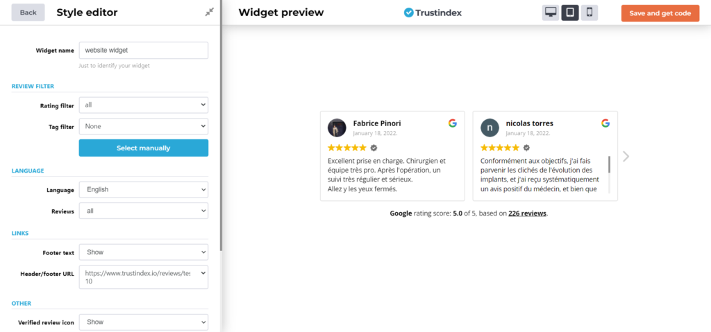 Check that the inserted widget is displayed with the proper language settings on your website, and that it displays only those reviews you wanted to add.