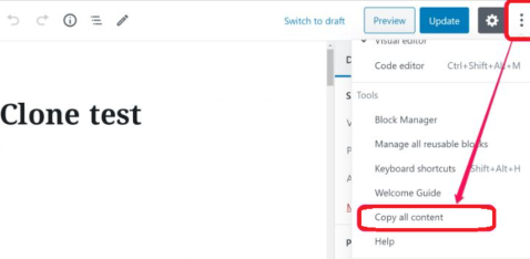 To duplicate a page or post. Please visit the page or post a page on your website. Select ellipses (the three dots in vertical orientation) to your right on a webpage. Choose a copy. The WordPress Editor opens instantly creating an updated post with duplicate content.