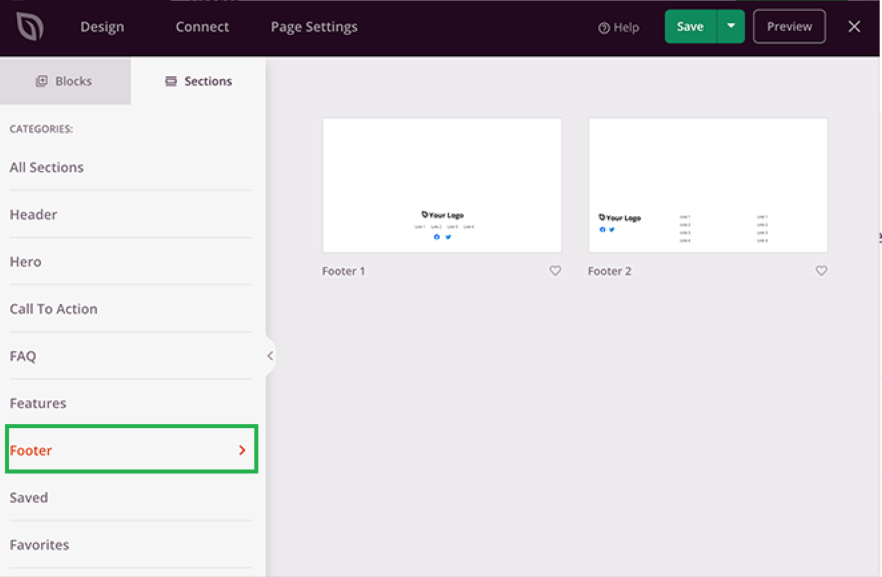 - When you have found the perfect template for your site’s footer, click on the ‘Plus‘ icon to add it to your page.