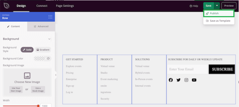 - Once you have finished customizing your page, remember to click the ‘Save’ dropdown menu and select the ‘Publish’ button to make your page live.