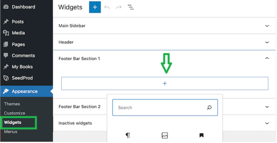 - Look for the “Footer Sidebar” section and click the “+” add block icon.