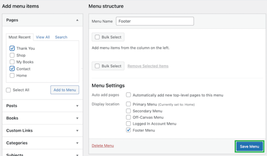 - Afterward, select the appropriate footer location, and finalize the process by clicking the ‘Create Menu’ button.
