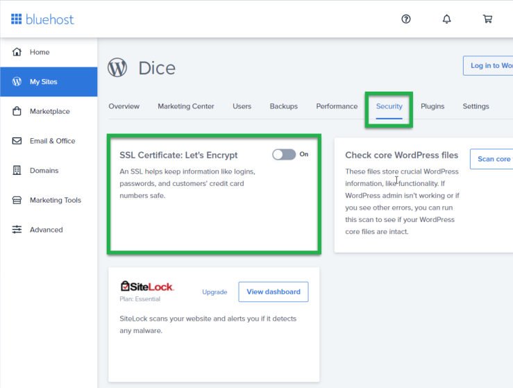 As an example, the hosting provider Bluehost offers Let’s Encrypt certificates that are conveniently accessible directly from the control panel.