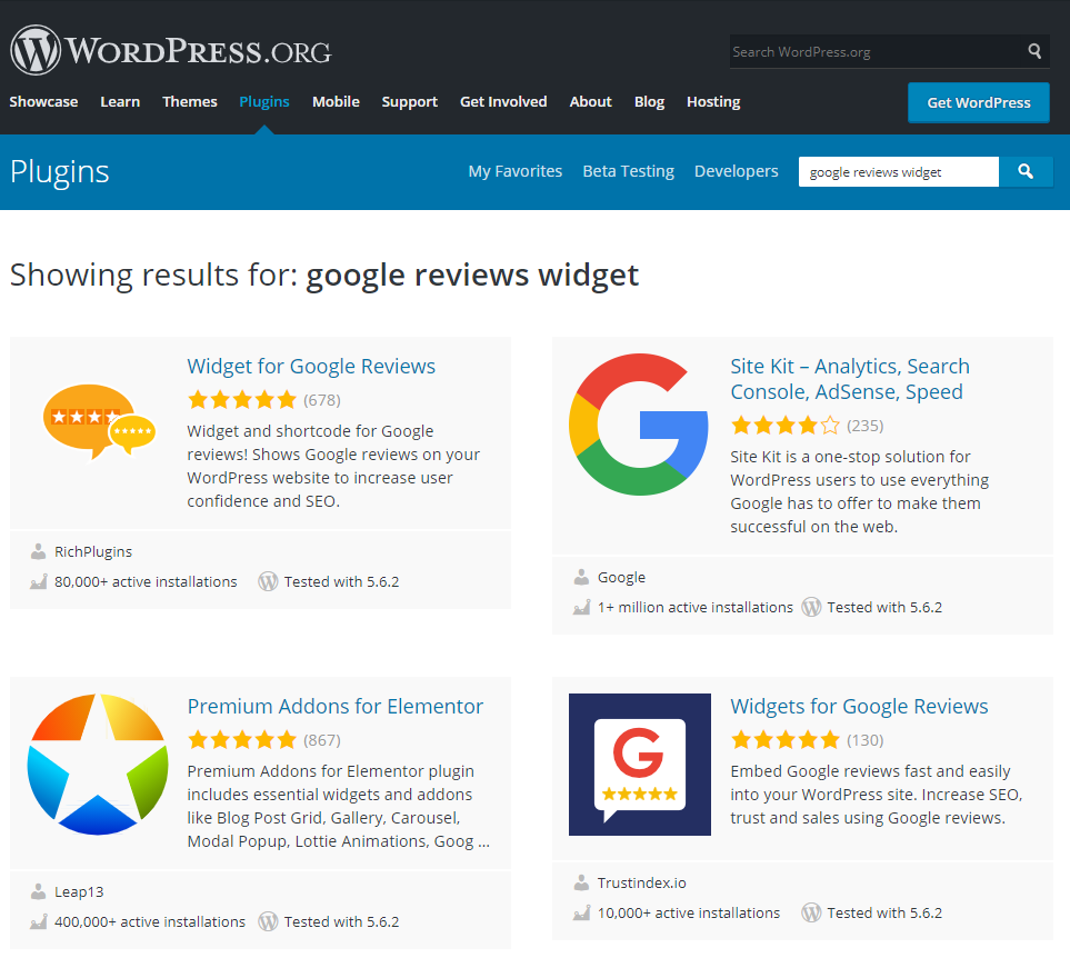 WordPress is still one of the most popular choices when it comes to developing a website, and it has its own catalog of review displaying widget plugins. Ther’s at least 24 pages worth of results when you search for „Google reviews widget”.