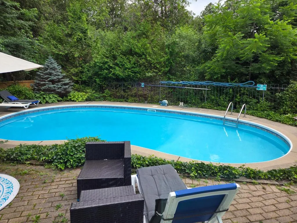 ☺ Located within walking distance of beautiful downtown Elora , this property is amazing! You feel like you have escaped into a private luxurious retreat. Sparkling clean swimming pool . A large hot tub and a spacious but cozy seating area outside. Top of the line appliances in a large brightly lit kitchen. Beautiful leather furniture and a cosy fire inside. Plenty of seating. Comfortable beds. High quality linens. A generous supply of pool towels. Luxurious toiletries. A sauna . And just down the stairs is the edge of the Grande River with a dock, kayaks ,canoes and a space for a camp fire. The host has thought of everything to make your stay absolutely delightful.