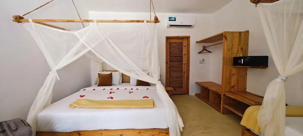 Pour 3 pax, je recommande le bungalow beach front B8 ! Idéalement situé, à 3 pas de la plage, 2 pas du resto de plage, 3 pas du bar de plage, 2 pas de la piscine et du ptit déj.