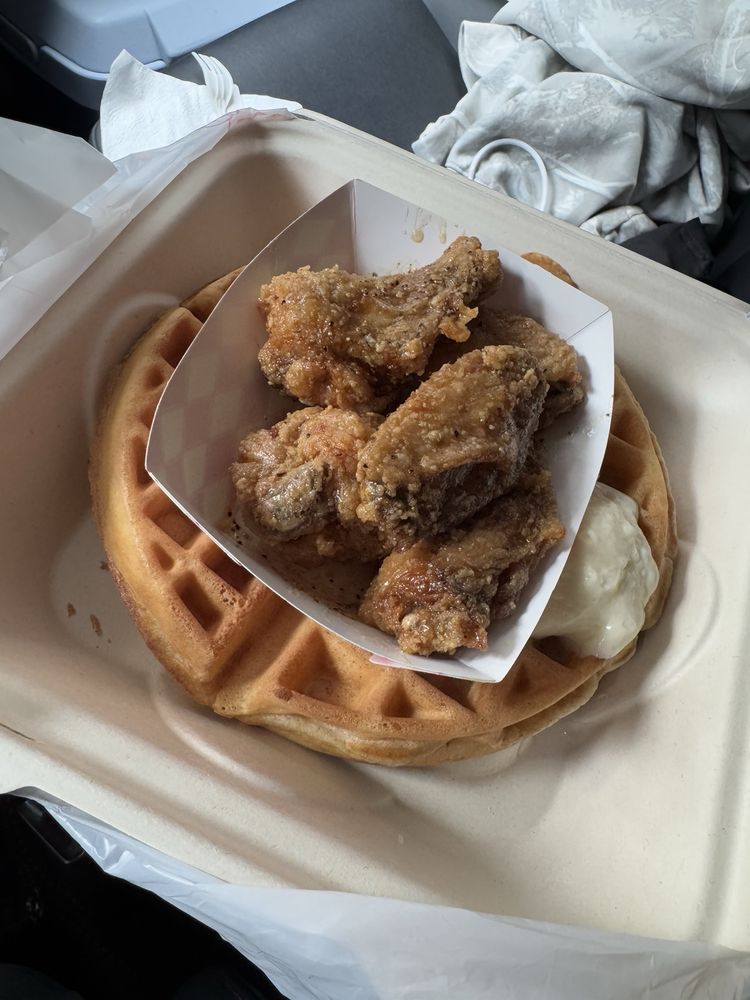 Got two orders of wings and one waffle. The wings came in orders of five but they were really small so will definitely order more in the future.