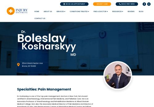 Dr. Boleslav Kosharskyy is a triple board-certified pain management physician specializing in anesthesiology, interventional pain medicine, and palliative care, recognized for his expertise in treating conditions like neck, shoulder, and back pain, often following a Motor Vehicle Accident (MVA). As one of the top pain management doctors in New York, he utilizes a multimodal therapeutic approach and specializes in interventional, minimally invasive treatments