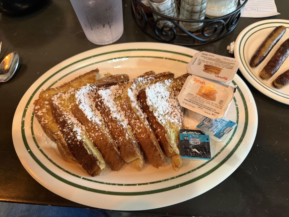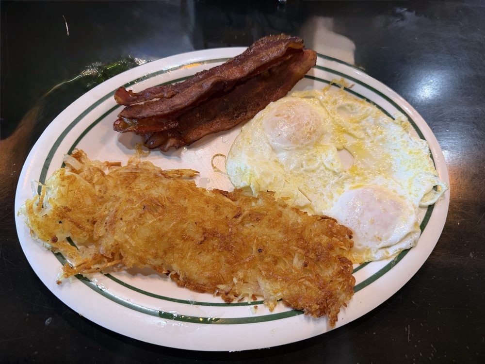Popular local eatery for breakfast. We seated ourselves and the hostess brought us our drinks. A few minutes later our food order was taken and we waited. Not long at all to be honest. Out came our food as ordered hot and tasty. Eggs were perfect hot and runny. Hash browns crispy and the bacon crispy but not too. Toast was buttered in the kitchen but they gave me some more on the side. French toast was a good portion and very good. A very good breakfast. Both of us ate for about 20 bucks. The interior was bright and clean. Protip: you know it is a good spot when you see the Sheriff's deputies are there.