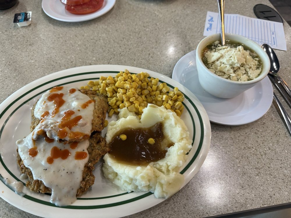 Wednesday special - chicken fried steak with potatoes and corn,also comes with soup or salad, I got the Italian wedding soup - very good. Service was good and fast, the owner Margarite checked on us several times, kept the water and coffee filled. I like the quiet ambiance, light country music in background and the TV's tuned to cooking shows ( on mute)