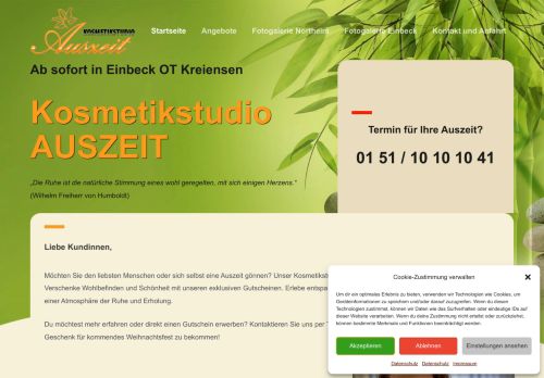 Ich war damals schon oft in der Auszeit in Northein aber vor 2 Wochen im neuen Studio in Kreiensen. Es ist sehr ansprechend geworden. Hier gefällt es mir noch ein bisschen besser als damals in Northeim. Parkplätze direkt vor der Tür, viel heller und freundlicher eingerichtet. Das Team super zuvorkommend- obwohl ich viel zu spät kam, wurde improvisiert und auf all meine Wünsche (Hautprobleme) eingegangen. Jetzt benutze ich auch die empfohlenen Kosmetikprodukte. Die Haut ist schon erheblich besser geworden! Immer wieder gern.