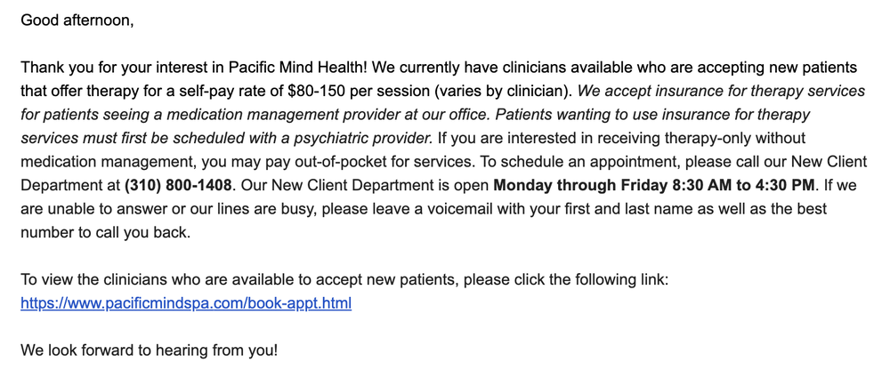Reply from Pacific Mind Health - TMS Therapy & Psychiatry, Long Beach