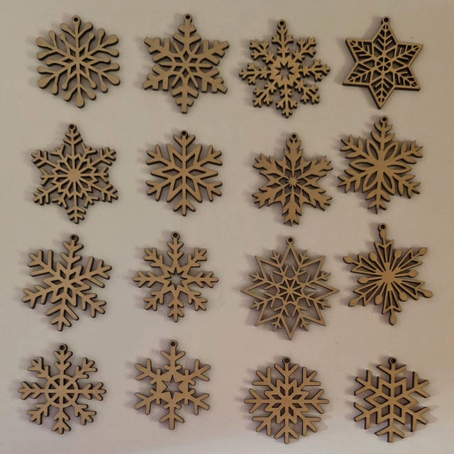 Intricately cut snowflake ornaments in 16 different patterns. So freshly made that I could still detect the aroma of the wood. Looking forward to giving them as favors at our daughter's December wedding reception.
