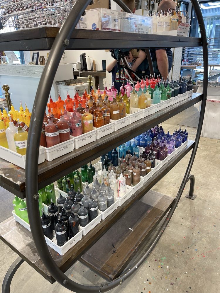 Great activity with the friends! Lots of different items to choose from. Pretty good explanation of the process. I recommend getting there early to look at patterns and colors. One thing they don't tell you that you don't think about the first time is that unless you are doing paper, scarf, or something else flat, the design you make is not what you'll end up with. My only other issues was that we had offered to return to pick up our items after going to eat, but they dried them "good enough" and paint from my planter came off onto the bag it was in.