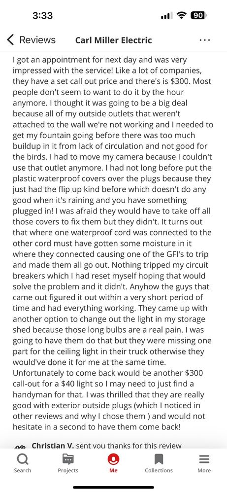 This used to be Carl Miller Electric but Carl passed away and luckily Christian is still there! He came before to fix something that I thought was going to be extremely complicated and he figured it out in no time! and at a price I thought was way less than I was going to pay. You pay for a callout fee but that normally includes all of the work, not additional unless you have extra stuff like I added on today and even then it was very reasonable! I wouldn't think of calling anyone else! It's now changed names but it's the same great company! Christian is a super sweet, kind, respectful, amazingly gifted Electrician. He did three completely different jobs for me today and I am as impressed as I was the first time! He's a hard worker, honest and fair and as I said amazingly talented! Unfortunately they lost the reviews supposedly from Carl Miller on yelp but I was still able to pull up my first review. I will put a picture of that here if you can read it? Don't hesitate to call I will never call anyone else for electrical needs! I'm so tired of feeling like people take advantage of middle-aged females and I have experienced that many times since moving here but definitely not from Christian! The best of the best! Call him!