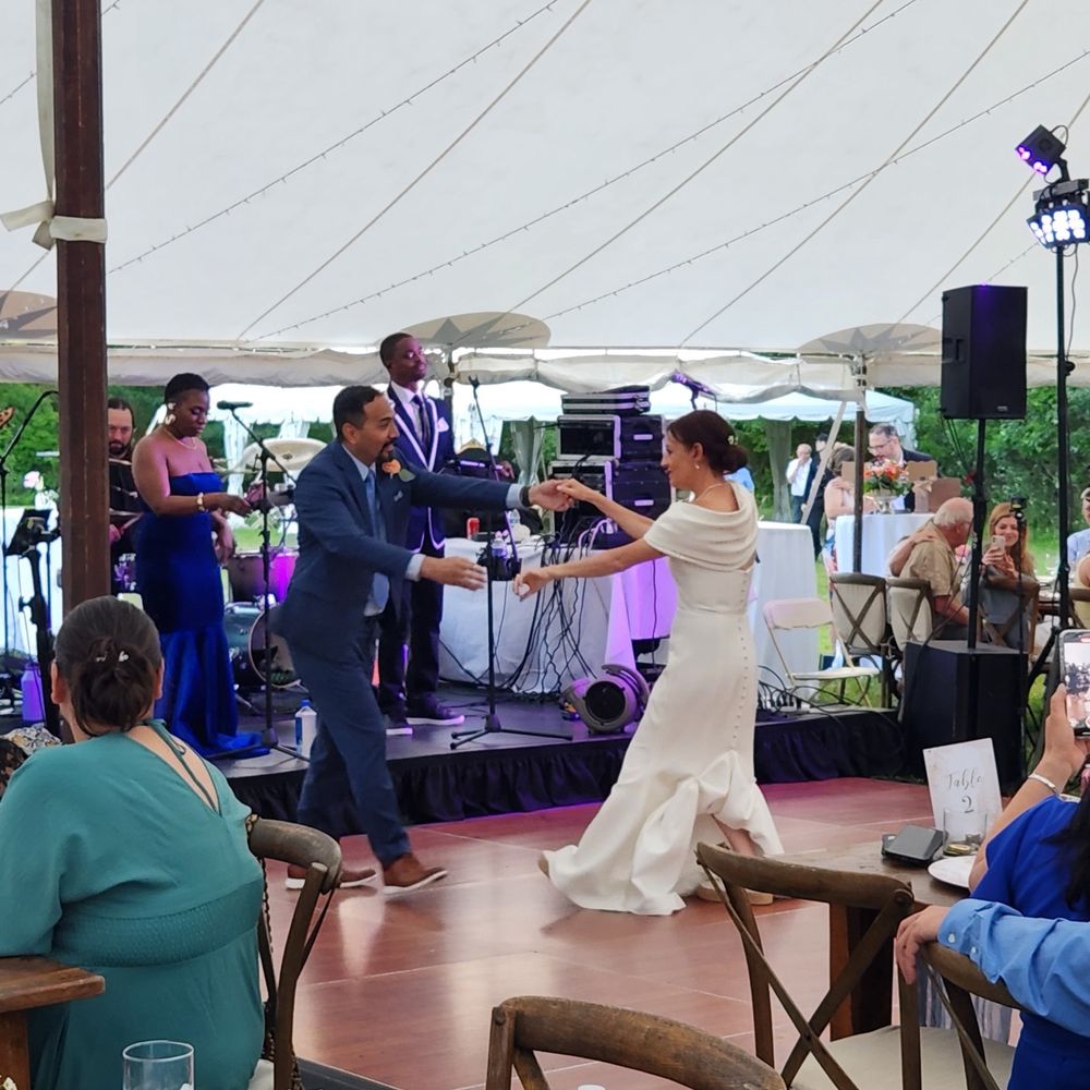 Let’s get one thing straight: Groove Authority didn’t just play our wedding—they torched the stage and left the tent in a cloud of confetti and happy tears. We hired their full 8-piece band and held our reception under a circus tent in South Dartmouth. But don’t let the quaint coastal vibes fool you—this was an arena-worthy, genre-blending musical blowout. They opened with our first dance: “Fly Me to the Moon” by Frank Sinatra—smooth, classic, and romantic enough to make the moon blush. Then the band took off like a rocket. Their emcee? Electric. Dude was running the show like a late-night host meets soul singer—getting the crowd hyped, guiding the flow, and belting out tunes like he was born holding a mic. Let’s talk setlist. They delivered funk, soul, pop, R&B, and rock with the precision of a Swiss watch and the sass of a dance floor icon. And when they leaned into rock—honey, they leaned all the way in. Guitars blazing, drums thunderous, and a badass drum solo that had everyone losing it like they were at Led Zeppelin concert in a tux. And then—the voice. Their female lead vocalist? Pipes like Tina, soul like Aretha, and stage presence like Beyoncé on a mission. She didn’t just sing—she slayed. Every note was a sermon. Every high belt was a spiritual experience. She had guests fanning themselves, grabbing their chests, and yelling “YES MA’AM!” after each verse. She didn’t come to play—she came to bring the house down. We knew we were witnessing something special when dozens of guests and multiple vendors came up to us asking, “Where did you find this band?!” The buzz was real. Based on that reaction alone, we knew we had hit the jackpot. We even saw relatives dancing we’ve never seen dance before—the shy ones, the quiet cousins, even the stoic uncles. Old and young alike were on that dance floor like they’d just been blessed by the funk gods. At one point, it felt like we were back in 1981, when you popped in a cassette, fluffed your hair, and sang into your hairbrush like your life depended on it. And then—our finale: “Don’t Stop Believin’.” Our handpicked closer. And they delivered it like it was the last song Earth would ever hear. The tent erupted. Phones were out, hands were up, voices were hoarse. We were one big joyful, Journey-singing family. If you’re looking for a wedding band that doesn’t just “perform” but serves up a soul-scorching, guitar-blasting, rock ‘n’ roll revival in formalwear, Groove Authority is it. Book them. Wear comfy shoes. Prepare to dance like you mean it. And thank us later!