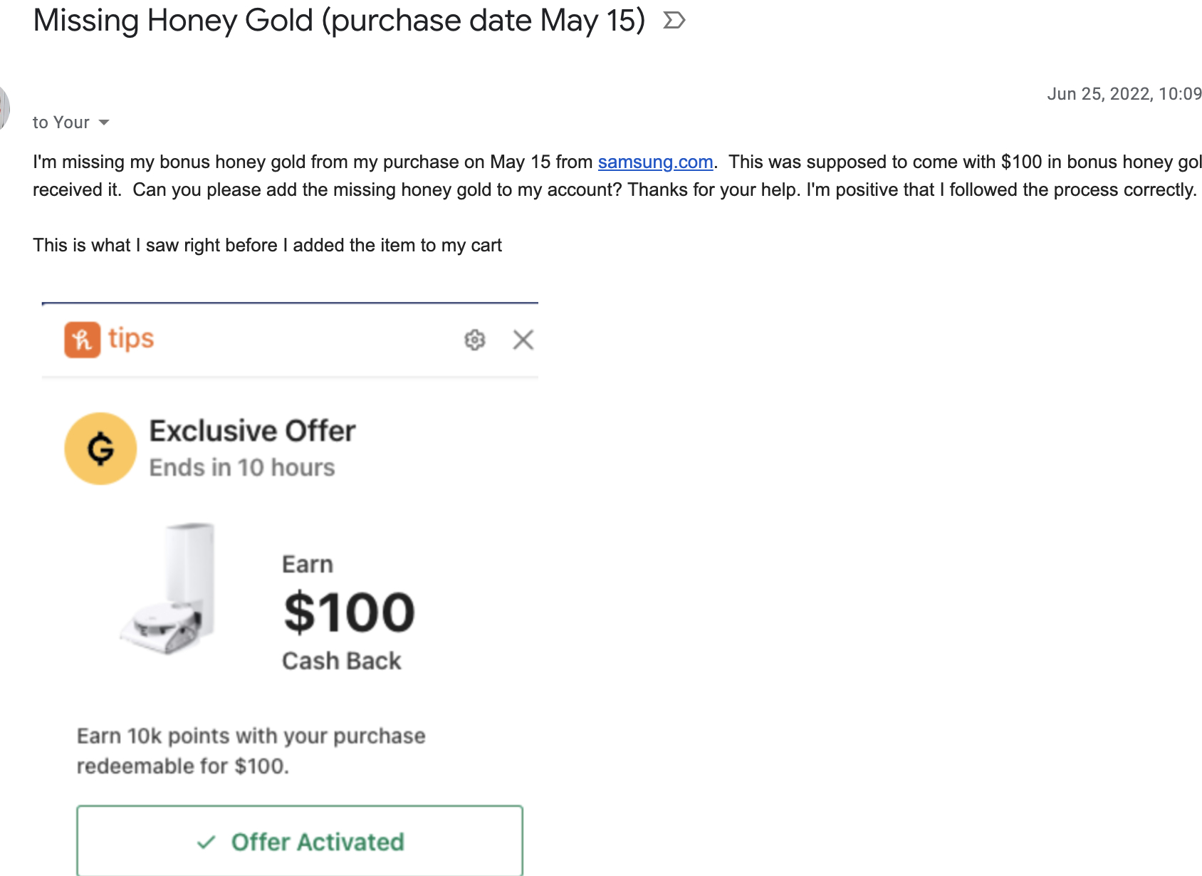 I was given an offer of $100 Bonus Honey Gold on a purchase. The reward did not post to my honey account after I made the purchase. I contacted their customer service multiple. I got no reply. After 6 months, I filed a complaint with the Better Business Bureau (against PayPal who owns Honey).