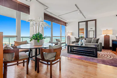This is a lovely condo in the Setai. It is beautiful, clean and had everything we needed. The hosts & Diego were quick with response time for all inquiries & requests. The hotel is over the top deluxe with amazing restaurants and pool area. Service was 5 star. Will definitely try to book this again! We had 3 people (one on the sofa bed)…it was plenty of space, but perfect for 2. The balcony was huge with nice furnishings..although with the new hotel construction next door it was hard to enjoy during the day—-but that was pool time anyway! To be fair construction is heavy ALL over SB.