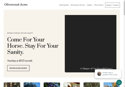 Olivewood Acres is so amazingly special !!! When it came time to find a place for our horse Lewis to retire to ...this place just kept showing up on our searches and we keep passing over it because it was 90 minutes from our home. But my daughter and I thought lets drive down and just check it out ....there is no way it looks like the photos and video... Well we were so wrong.. Olivewood Acres is so much more amazing than any social media you might see.. the facilities are stunning, but even more Tobey, the owner, and Nyna, his right hand, are amazing... I can not say enough about them and this place...Tobey is constantly maintaining the facilities, upgrading it and shows such pride of ownership. From his families nightly walks around the grounds just loving on the horses and more.. He made us feel so welcome, made us feel that every acre was there to explore and share with our horse... Nyna is the Heart of this place. She cares so deeply for your horses and for you... you can feel it ... she is always loving on the horses, making sure they are healthy, well taken care of and happy to give updates.... while we could only come down a couple times a week to visit with lewis we knew he was getting loved and cared by Nyna, Tobey and everyone at Olivewood. We came from a Show Barn environment and we wanted a place for Lewis to just be a horse, hang out in his massive private paddock with his adorable covered house/stall, with trees, birds, breezes and horse friends. We wanted large pastures for him to roam and run and visit with other horses...showers to pamper and care for him when we visit.. and if we wanted to there were trails to ride. Some of our favorite moments were just sitting on the Boulders in the pastures with Lewis while he ran around and explored or sitting under his private tree just hanging in his amazing paddock.. Lewis changed while at Olivewood, he loves it there and it is so amazing !!!! we love it there ...it is magical...You can not pick a better place for your horse.. if you can only see them a occasionally they are so well loved and if you can have daily visits etc. its just honestly an magical place for both you and your horse.... you will love your time at Olivewood and NEVER REGRET IT !!