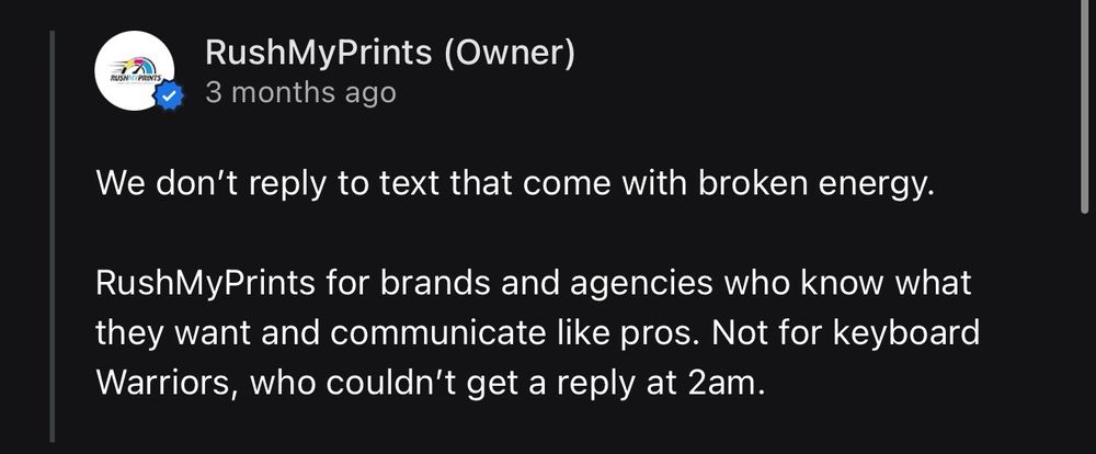 RushMyPrints for brands and agencies who know what they want and communicate like pros. Not for keyboard Warriors, who couldn’t get a reply at 2am.