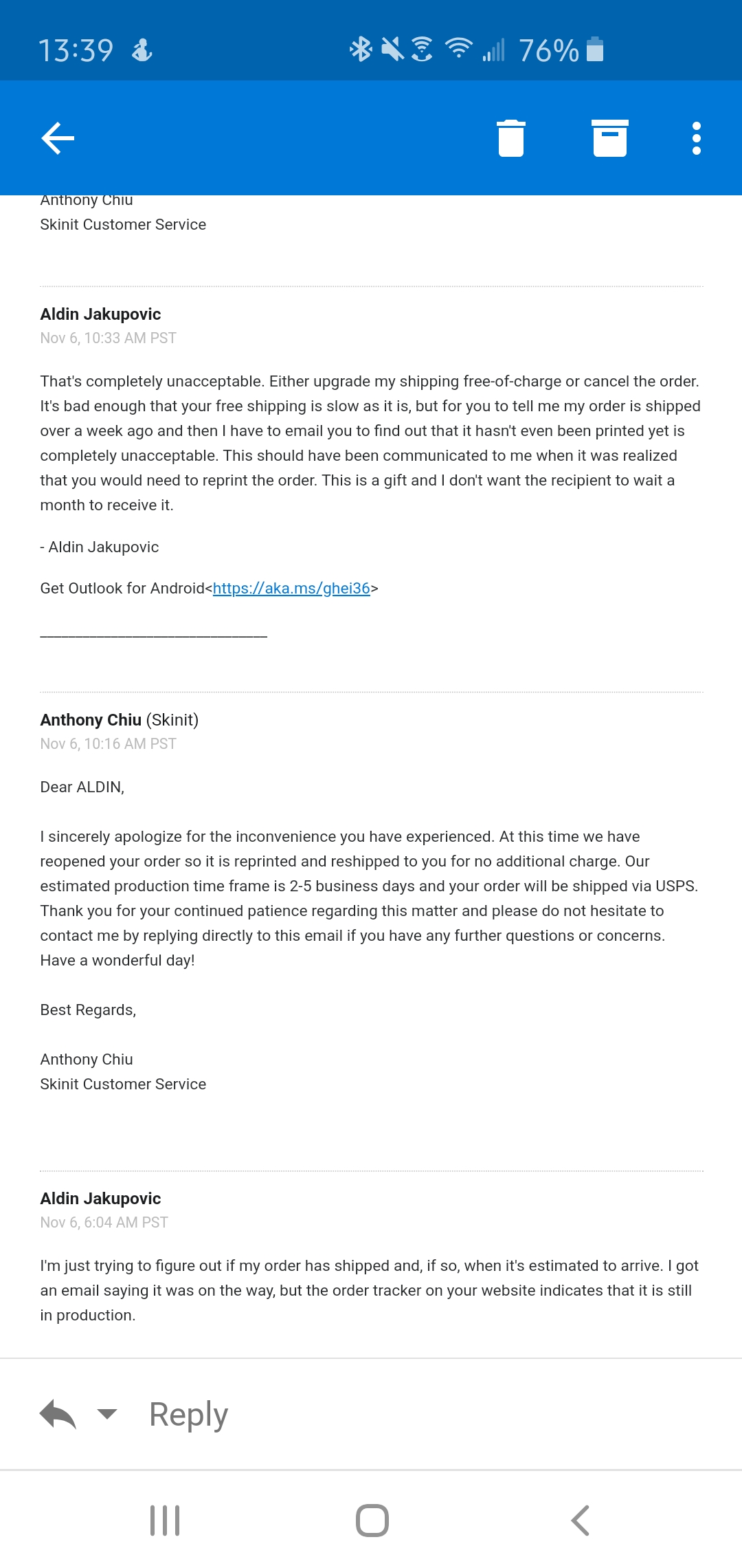 AVOID this company at all costs. Their website looks good and was enough to draw me in to make a purchase but dealing with them is a complete headache. I can't imagine how unprofessional things must be on their end. I placed an order a few weeks ago and I received an email on 10/28 that it had shipped. Their free shipping method is painfully slow (you could probably hitchhike from SD to Chicago faster) but it's free so that makes it more acceptable. So I waited and waited, checking my mail after giving it a week of transit time since they don't provide tracking information with their free shipping and nothing showed up. Even stuff I ordered from the UK AFTER ordering from SkinIt had already showed up. I finally go online and track the order on their website and it says that my order hadn't even shipped yet and was still being printed! I emailed them to find out what was going on and they informed me that the order had been "reopened" (who closed it?) and that it would ship within 2-5 business days, plus an additional 7-10 business days for delivery on top of the damn near 3 weeks I have already waited! But at least they appreciated my patience and apologized for any inconvenience (helpful right?). No explanation as to why it hasn't shipped. Why it was "reopened"? Why did I have to reach out to them first instead of them informing me considering the huge delay? Basically just a "sorry" and keep waiting and we may or may not decide to ship your order. I told the customer service rep via email that I wanted free upgraded shipping due to the inconvenience that was entirely their fault and they wouldn't even consider it so I just cancelled the order instead. You charge $17 for a piece of 3M film, have the slowest snail mail shipping, and can't even provide the simplest form of customer service to a justifiably disgruntled customer? I'll be sure to spread the word. Thanks!