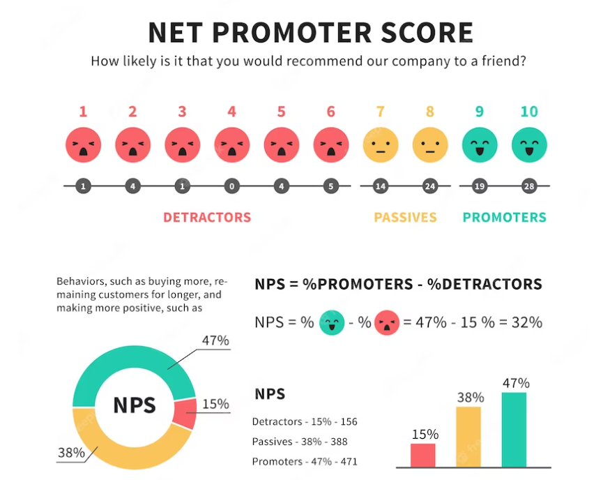 Suppose you administer the survey to 100 customers, and all of them provide responses. Among the respondents, 15 customers rate their likelihood of recommendation from 1 to 6 (detractors), 30 customers rate it as 7 or 8 (neutrals), and 55 customers rate it as 9 or 10 (promoters).