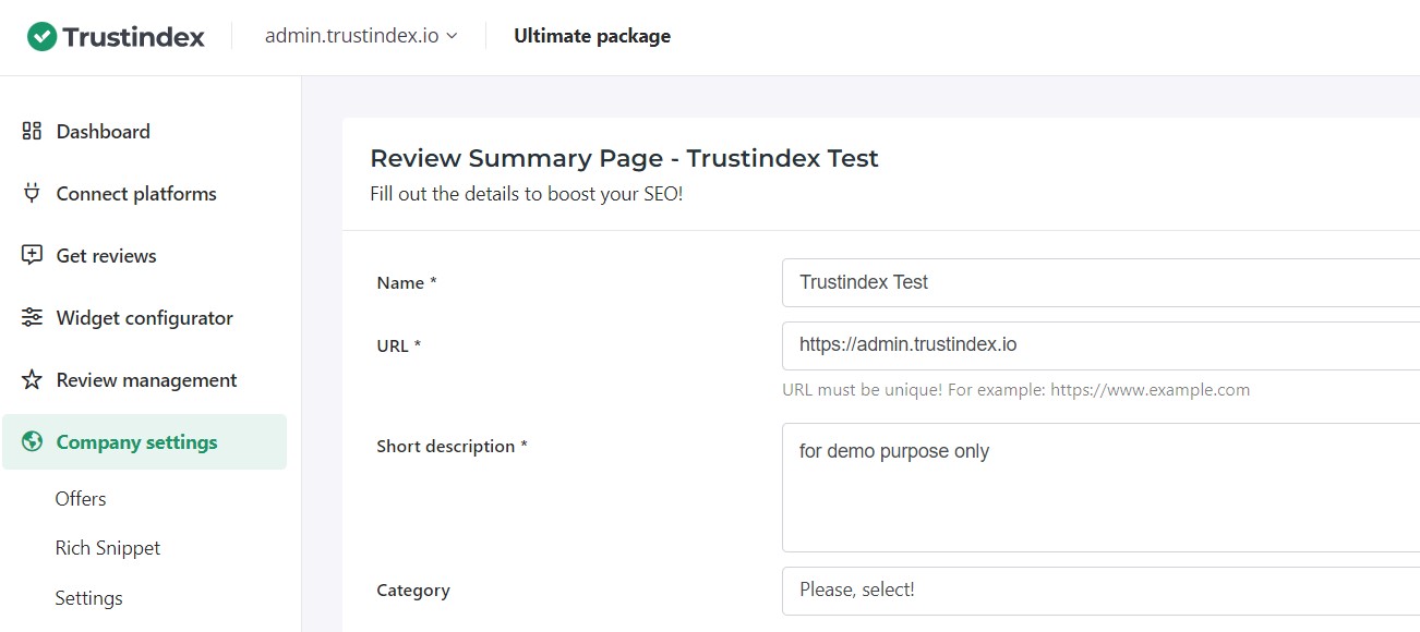 Under the Company Settings menu, you can fill out the main details about your business that will appear on your Review Summary Page, such as: