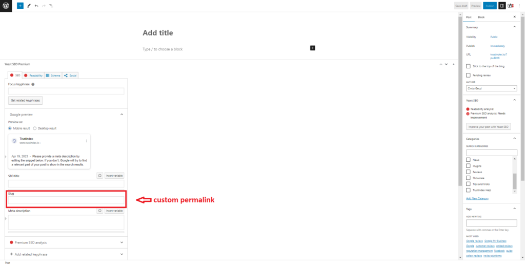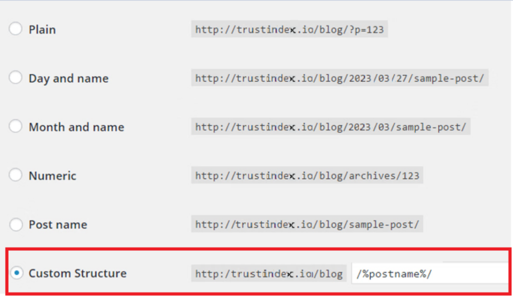3.) Post name: A descriptive title or keyword that summarizes the content, such as “https://www.trustindex.io/my-post/“.